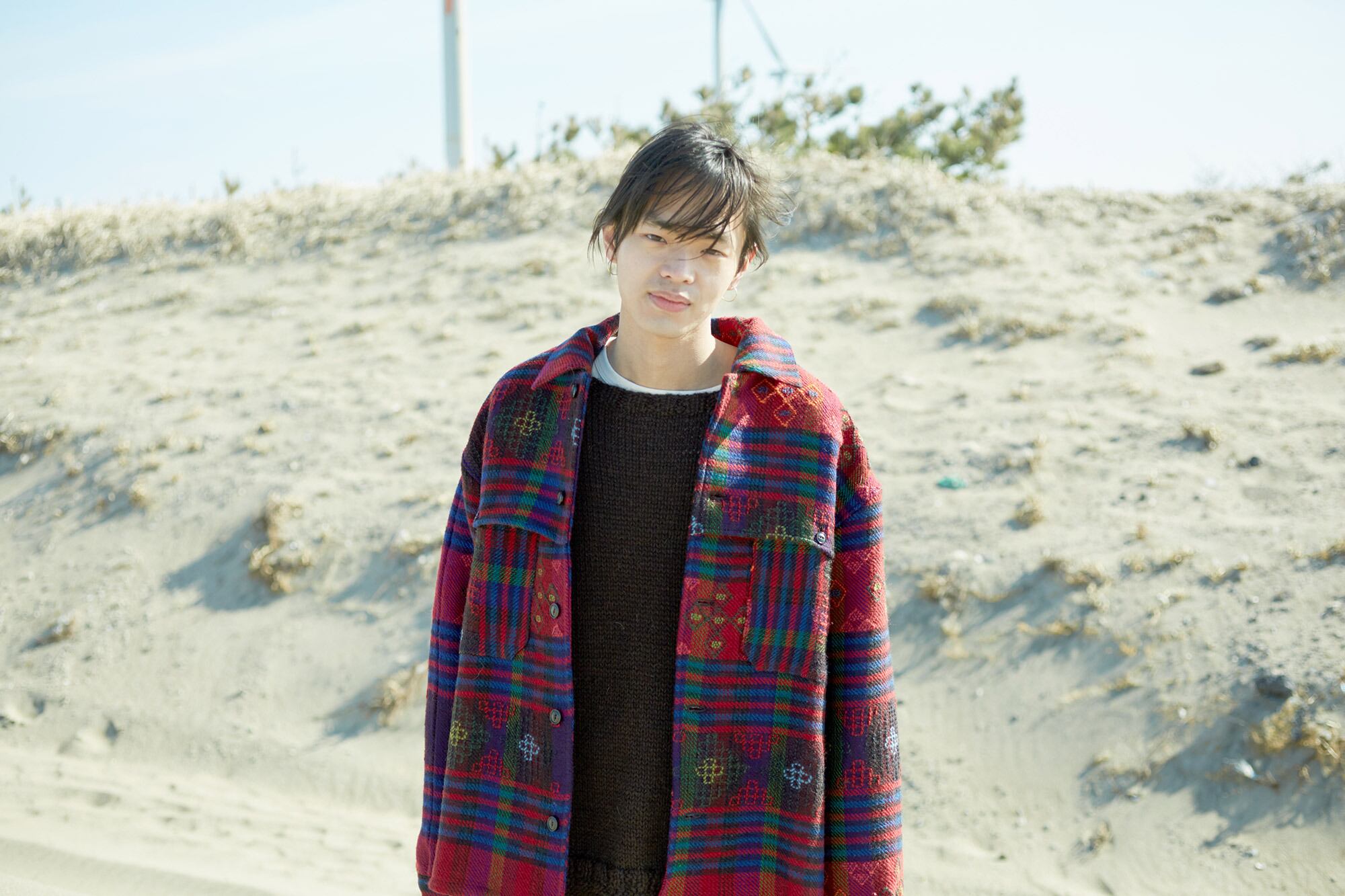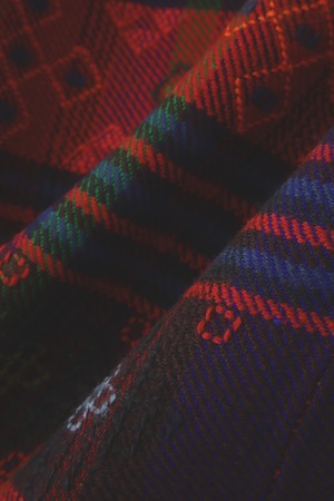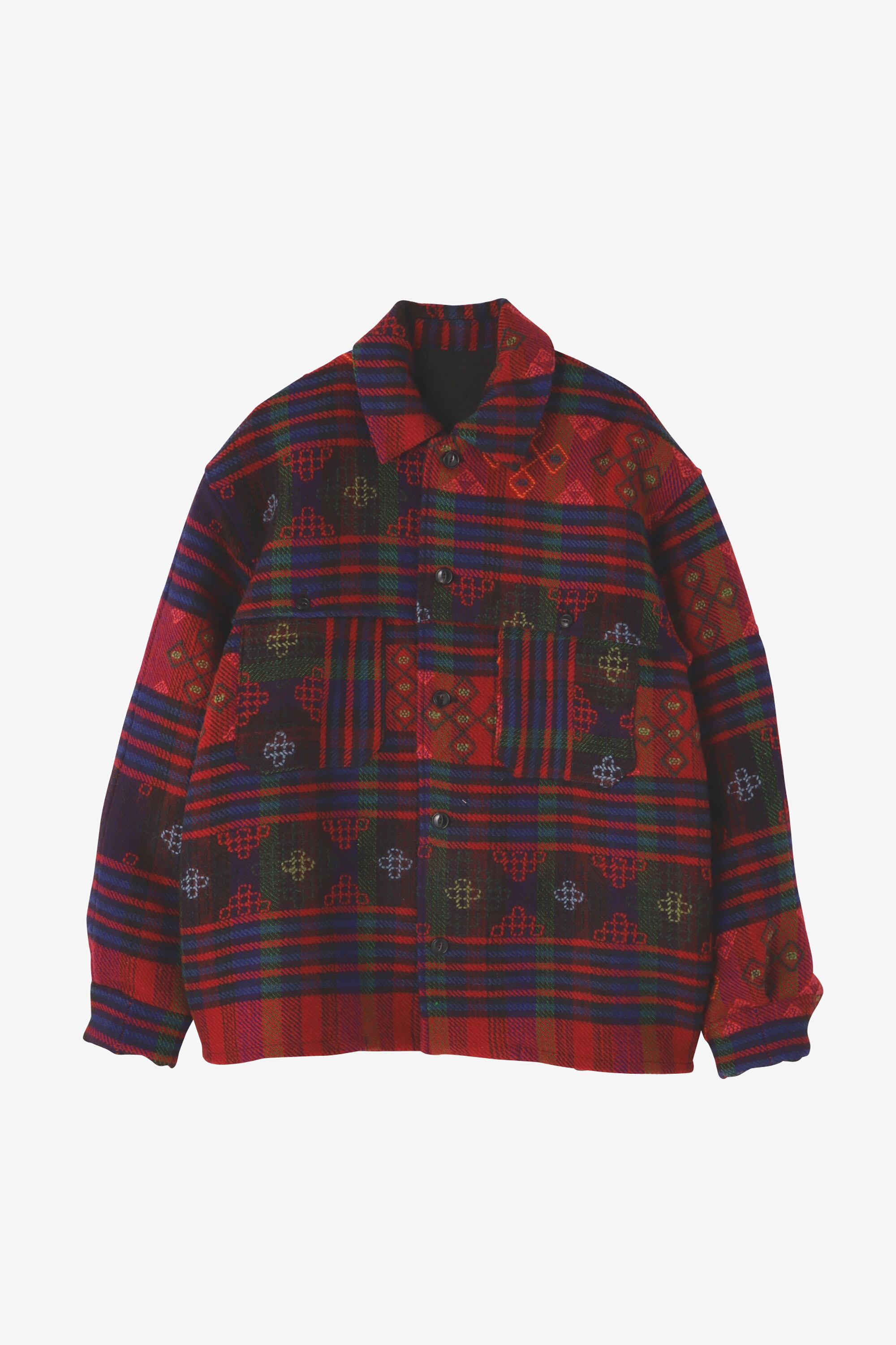 "Bhutan Textilesの手織の布を使い、木こりが着用していたシャツジャケットのディティールを参考にしたワークシャツを制作しました。ヨークがフラップを兼ねたクラシックな仕様の胸ポケットが特徴です。布の所々に織り込まれた模様は、「守 (protection) 」などの意味を持つそう。"